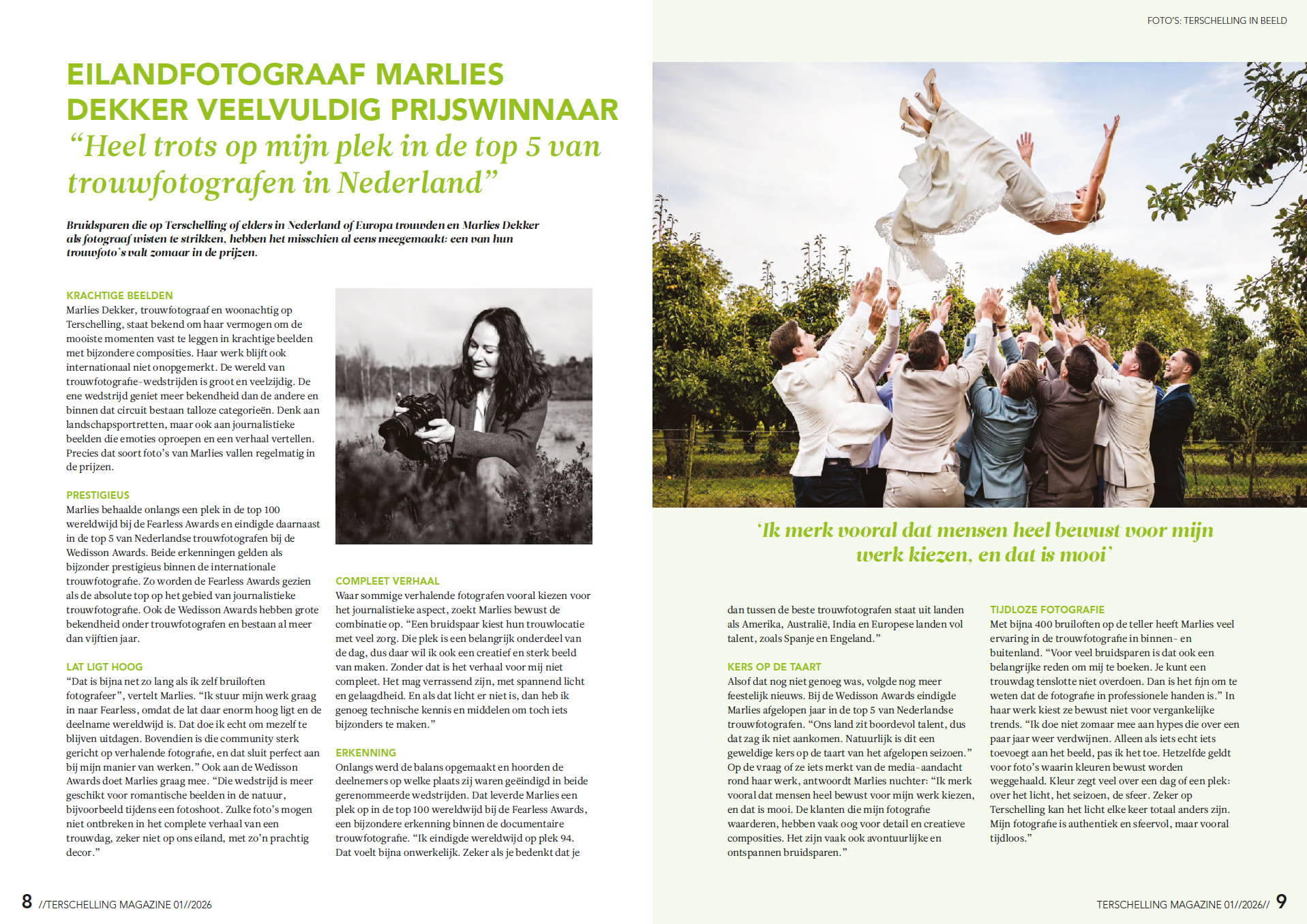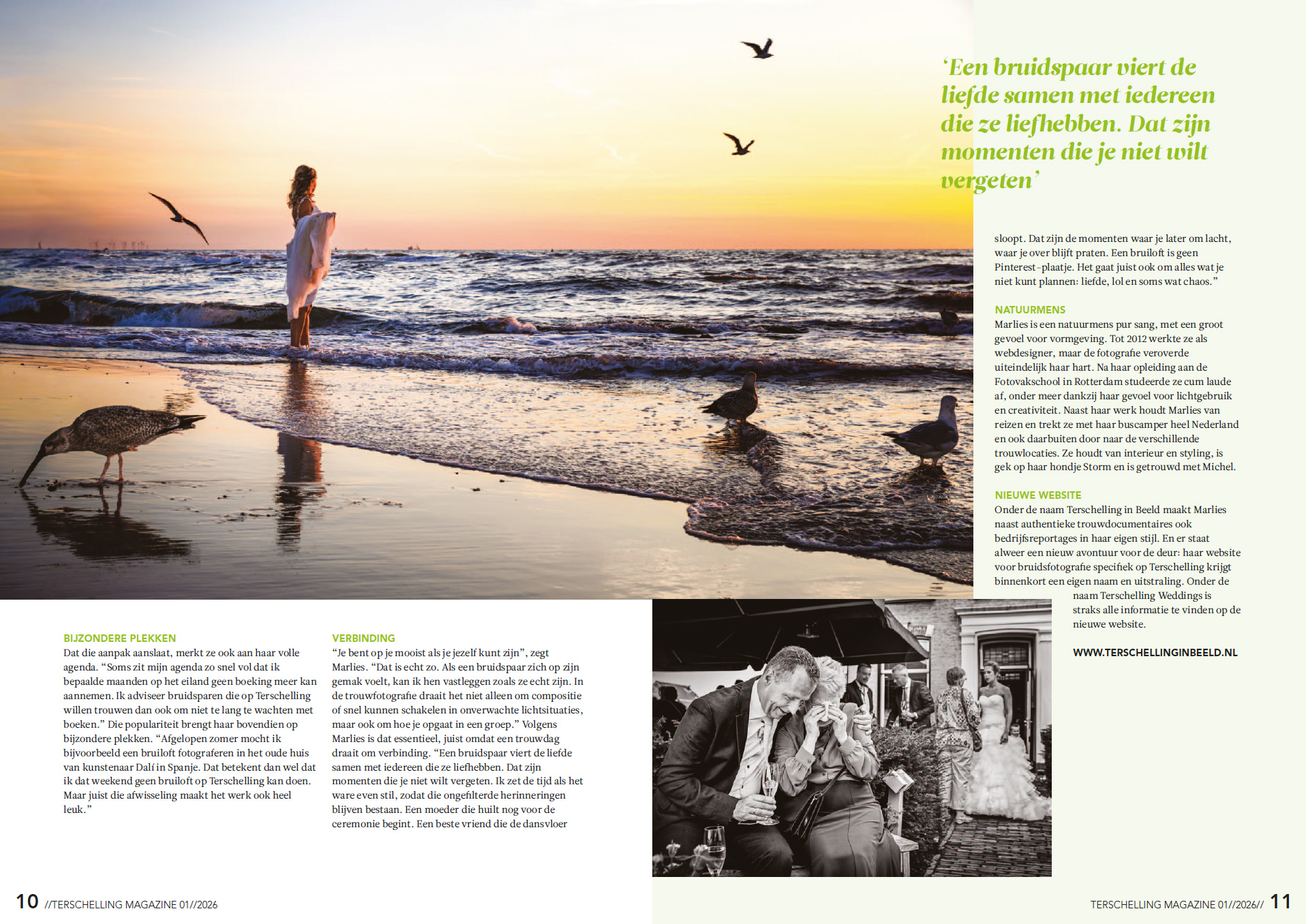 Als ervaren journaliste vroeg ze me de hemd van het lijf over mijn werk als trouwfotografe, want daar ben ik tenslotte het meest om bekend hier op het eiland. Naast mijn fotografie voor Terschellinge magazine en diverse bedrijfs- en familieportretten is mijn verhalende wijze van fotograferen ‘de tak van sport’ die me het meest aan het hart ligt.